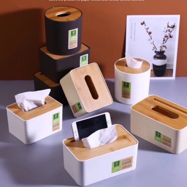 Hộp đựng giấy ăn mặt gỗ tre có khe gài điện thoại free ship